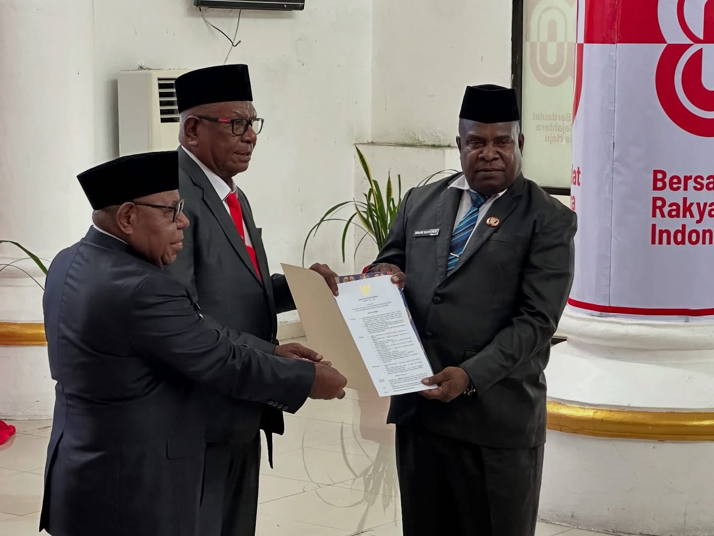 Capt: Bupati Mimika Johannes Rettob didampingi Wakil Bupati Emanuel Kemong menyerahkan Surat Keputusan (SK) kepada Pj. Sekda Abraham Kateyau, Jumat (15/8/2025). Foto/Istimewa