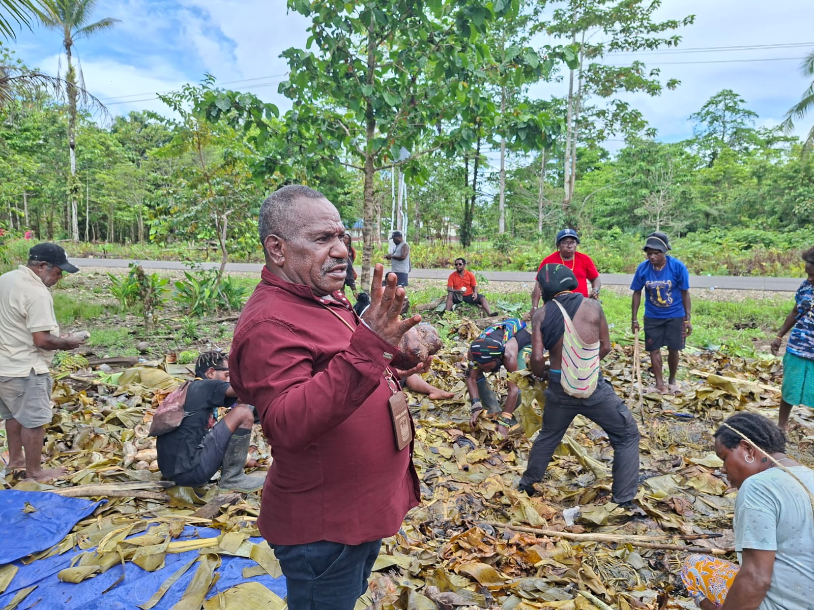 Capt: Wakil Ketua Komisi I DPR Papua Tengah, Yohanes Kemong, saat melaksanakan reses di Distrik Agimuga, disertai suasana prosesi bakar batu bersama masyarakat. Foto: Stendy.