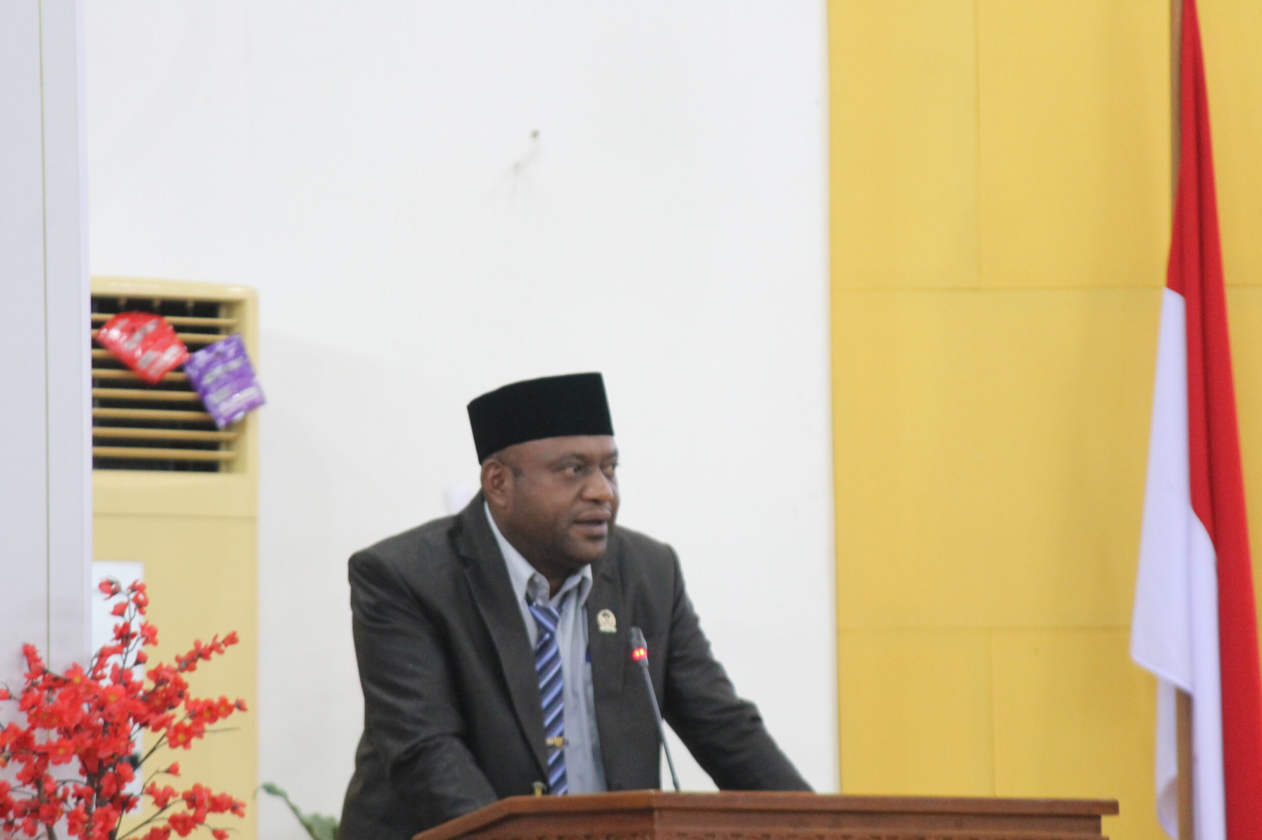 Capt: Anggota Fraksi Gerindra DPRK Mimika, Yan P. Laly, S.T., saat menyampaikan pandangan akhir Fraksi Gerindra dalam Rapat Paripurna IV Masa Sidang III. Foto: Stendy.