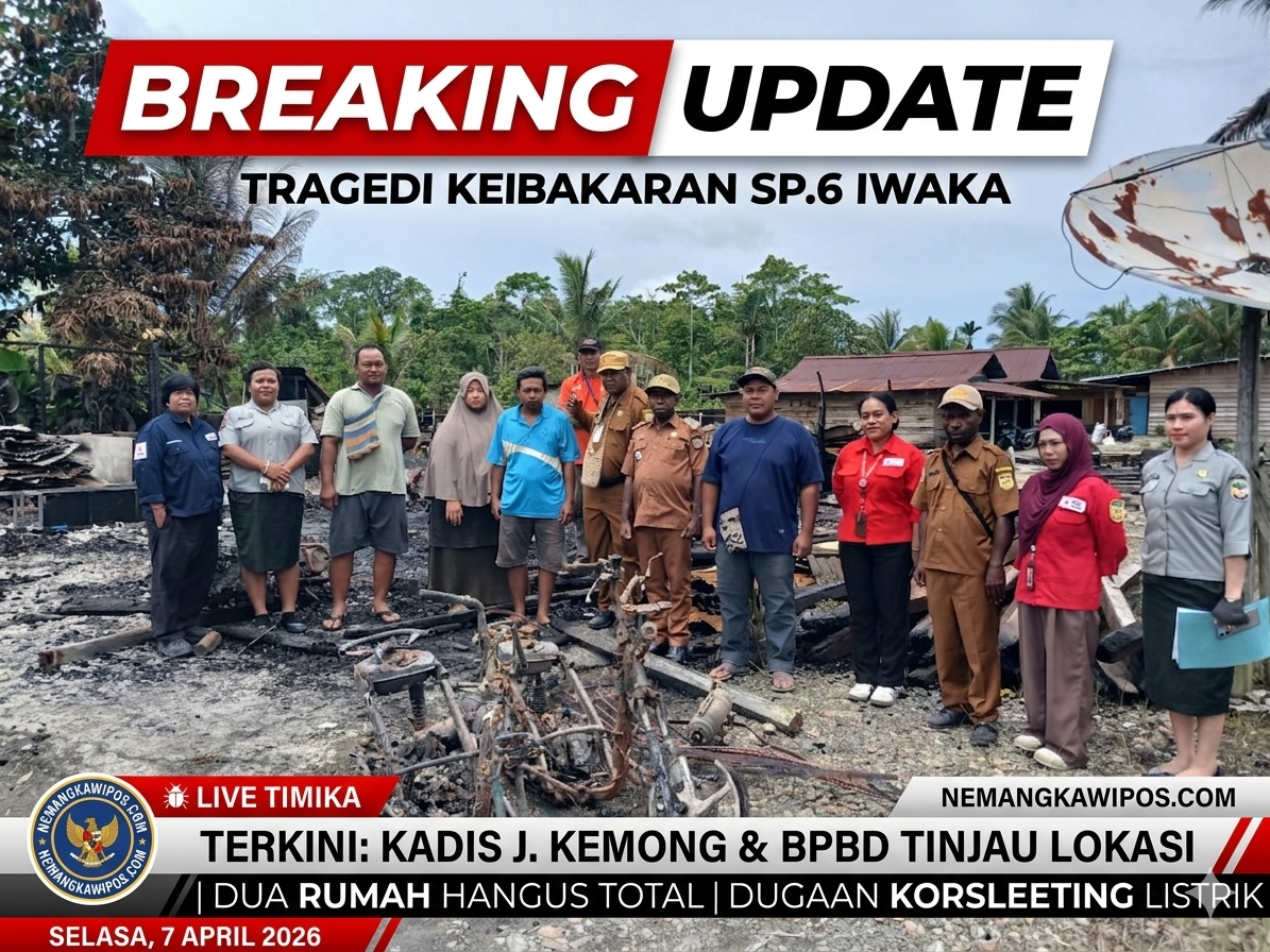 TIMIKA, Nemangkawipos.com – Kebakaran hebat kembali terjadi di wilayah Kabupaten Mimika. Kali ini, insiden tersebut menghanguskan sedikitnya dua unit rumah warga di Kampung Naena Muktipura (SP.6), Distrik Iwaka, Selasa (7/4/2026).