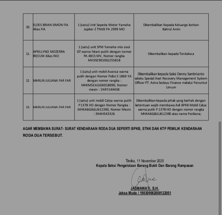 Capt: Surat pengumuman yang dikeluarkan oleh Kejaksaan Negeri Mimika. Kasi Pengelolaan Barang Bukti dan Barang Rampasan Kejari Mimika, Jasnawati, S.H., saat menyampaikan imbauan kepada masyarakat melalui surat resmi, Kamis (13/11/2025). Foto: Dok. Kejari Mimika