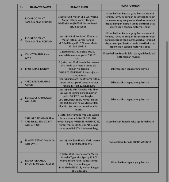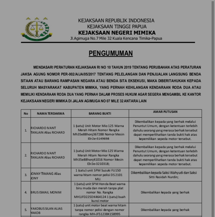TIMIKA, Nemangkawipos.com – Kejaksaan Negeri (Kejari) Mimika mengimbau masyarakat yang pernah kehilangan kendaraan roda dua atau memiliki kendaraan yang pernah terlibat dalam proses hukum untuk segera mengambilnya di Kantor Kejaksaan Negeri Mimika, Jalan Agimuga No. 07, Mile 32, Kabupaten Mimika, Kamis (13/11/2025).