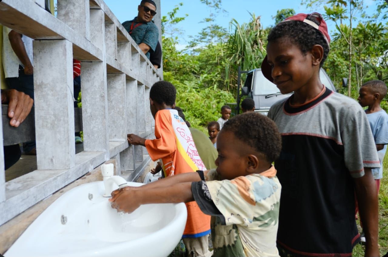 Capt : Panitia Natal Dataran Rendah PT Freeport Indonesia (PTFI) memberikan edukasi kebersihan sejak dini kepada murid Sekolah Gereja GBI Apache, Timika. Satu per satu anak mempraktikkan cara mencuci tangan yang benar.