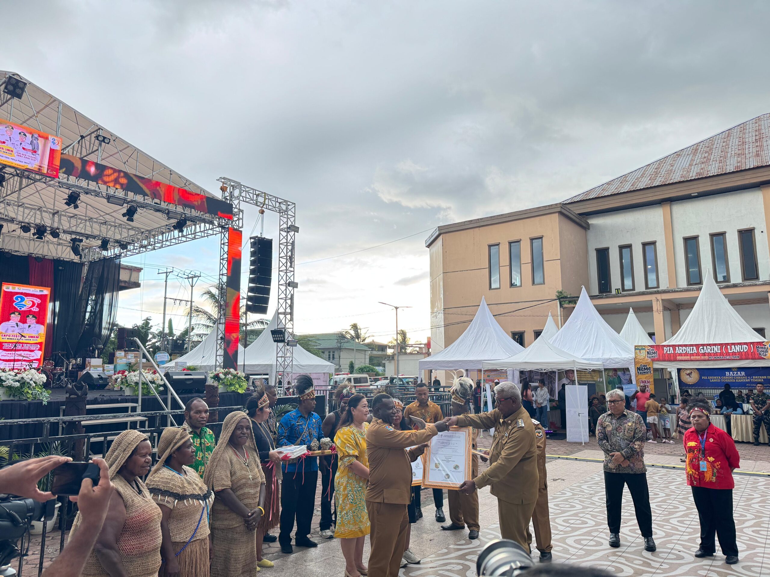 Penyerahan dilakukan pada momen Expo Festival UMKM 2025 yang digelar di halaman Gedung Eme Neme Yauware, sebagai bagian dari rangkaian peringatan HUT ke-29 Kabupaten Mimika.